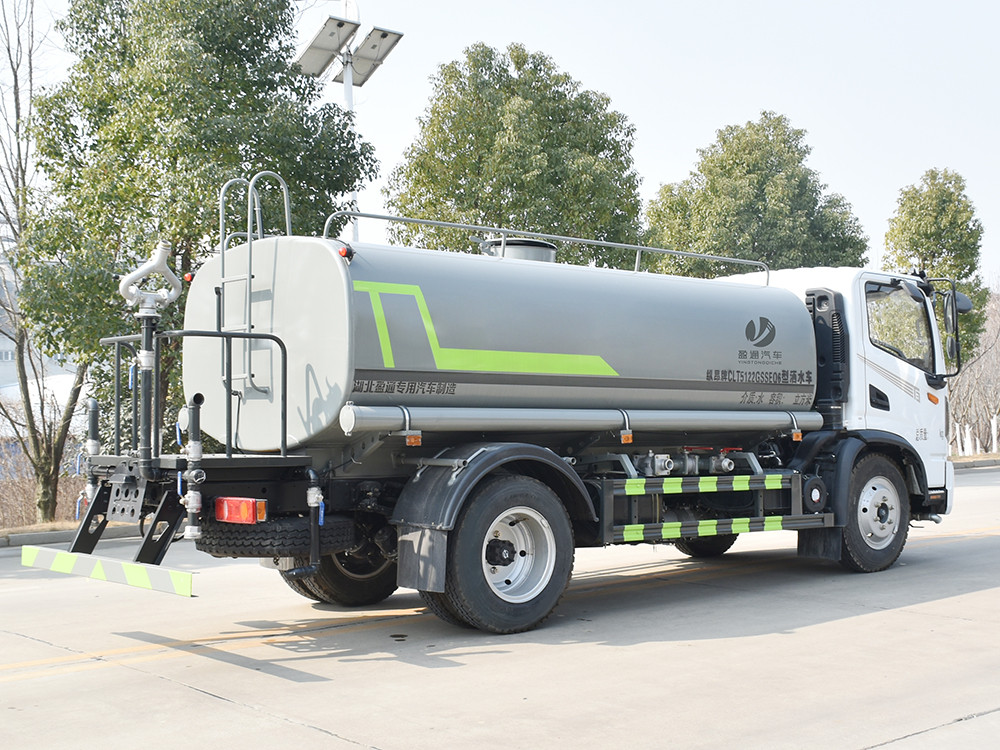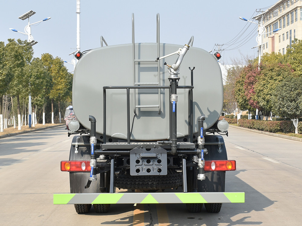 湖北盈通灑水車產品標配前噴(鴨嘴)、后沖、后灑、側噴、后置式工作 平臺,平臺上配置綠化水炮(可 360°旋轉,既可以調成柱狀,也可 以調成霧狀,更可以調成直沖狀、大雨、中雨、小雨、毛毛雨),配 備優質大功率專用灑水泵(可自吸自排,可從河里或池塘抽水到罐體), 取力器,雜物過濾網,消防接口,自流球閥系統、取力器、球閥、濾網 均為國家標準產品,主管道加粗,法蘭墊、法蘭盤加厚,大通徑球閥。 整體具備性能優良安全可靠、效率高、流量大、維修方便等特點。