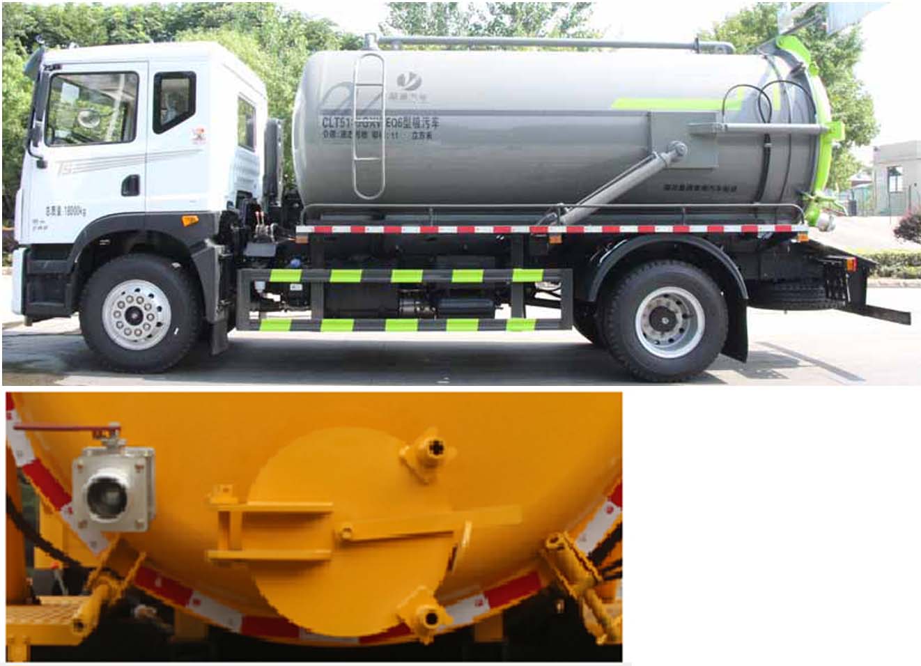 該車用于吸除水坑、下水道里污濁物;主要裝置有罐體及吸污裝置;該車具有舉升功能.罐體總容量:11.55立方米;罐體有效容積:11立方米;罐體外形尺寸(總長×直徑)(mm):5400×1800,4800×1800;ABS型號及生產廠家為:3631010-C2000/東科克諾爾商用車制動系統(十堰)有限公司,J ABS/焦作博瑞克控制技術有限公司;側、后防護材料均為:Q235碳鋼,連接方式均為:螺栓連接,后部防護截面尺寸(mm):120×50,后部防護離地高度(mm):450.僅采用底盤4500mm,3950mm軸距改裝.選裝后部出口樣式;選裝左側樣式.隨底盤選裝駕駛室.隨底盤選裝儲氣筒/尿素罐/電瓶框位置布局