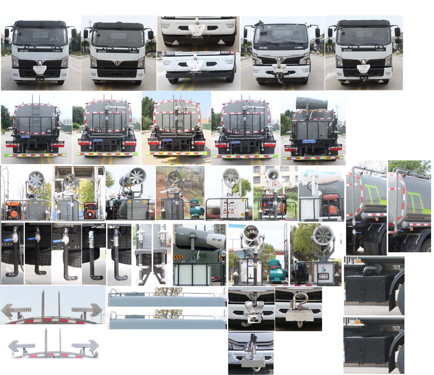 東風10方灑水車產品標配前噴(鴨嘴)、后沖、后灑、側噴、后置式工作 平臺,平臺上配置綠化水炮(可 360°旋轉,既可以調成柱狀,也可 以調成霧狀,更可以調成直沖狀、大雨、中雨、小雨、毛毛雨),配 備優質大功率專用灑水泵(可自吸自排,可從河里或池塘抽水到罐體), 取力器,雜物過濾網,消防接口,自流球閥系統、取力器、球閥、濾網 均為國家標準產品,主管道加粗,法蘭墊、法蘭盤加厚,大通徑球閥。 整體具備性能優良安全可靠、效率高、流量大、維修方便等特點