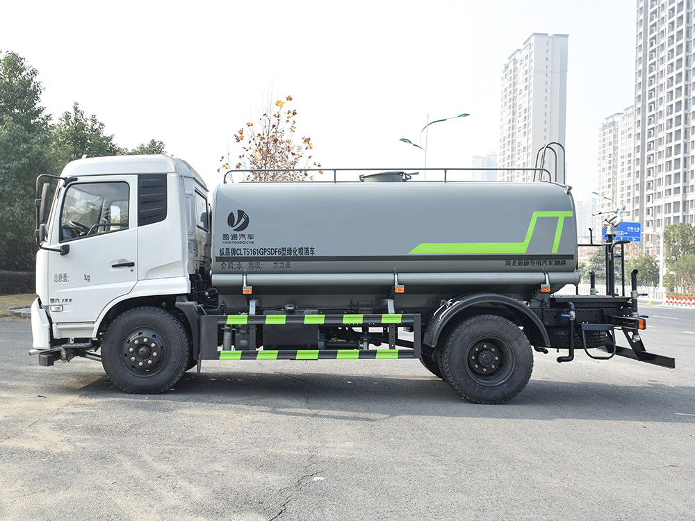 東風天錦12放灑水車標配前噴(鴨嘴)、后沖、后灑、側噴、后置式工作 平臺,平臺上配置綠化水炮(可 360°旋轉,既可以調成柱狀,也可 以調成霧狀,更可以調成直沖狀、大雨、中雨、小雨、毛毛雨),配 備優質大功率專用灑水泵(可自吸自排,可從河里或池塘抽水到罐體), 取力器,雜物過濾網,消防接口,自流球閥系統、取力器、球閥、濾網 均為國家標準產品,主管道加粗,法蘭墊、法蘭盤加厚,大通徑球閥。 整體具備性能優良安全可靠、效率高、流量大、維修方便等特點。