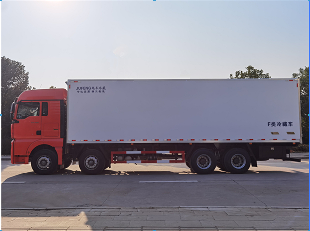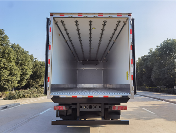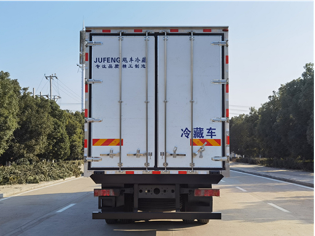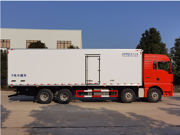 汕德卡9米6氣囊橋冷藏車廂體配置為:斷橋隔溫工藝,整體結構框架,內外面料為3mm新款啞光玻璃鋼夾保溫層真空復合而成,廂體厚度為8cm,最新款鋁合金包邊型材,型材局部厚度為4mm(鋼制鉚釘加固),廂體內部采用2個LED照明燈及廂體示寬燈,后門框不銹鋼材質,門框密封條為三元乙丙橡膠材質,加厚型不銹鋼合頁及鎖件;副梁為Q700車用大梁鋼,15mm厚大梁墊皮,加裝防撞膠塊,不銹鋼門鎖件,配后雙開門,副駕駛一側居中靠前開單側門一個,帶2個排水孔。汕德卡9米6氣囊橋冷藏車冷機配置:可選安裝颶豐,凱利,凱雪,冷王,開利等冷藏機組,最低溫度可達-18度。車廂內溫度可根據需求自由調節;溫度控制器安裝在駕駛室內,方便操作控制。選裝配置:通風槽,肉鉤導軌,卡槽等。