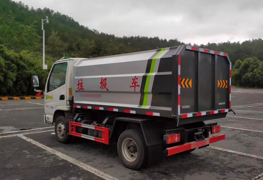 箱體容積3~4立方米,碳鋼邊三底四,國(guó)產(chǎn)油泵、多路閥、取力器、油缸,卸料方式為底部雙杠液壓舉升自卸,駕駛室外操作,鐵桶掛架,后門(mén)機(jī)械鎖緊,手動(dòng)開(kāi)門(mén),可選液壓開(kāi)門(mén)。