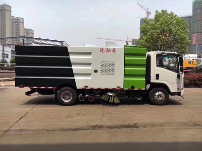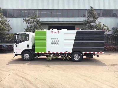 本洗掃車采用重慶五十鈴(700P)型國5二類底盤改裝,加裝副發動機、風機、高壓水泵、清水箱、垃圾箱、左右立掃、帶噴水桿的寬吸嘴、低壓沖洗系統、垃圾箱自潔,掃盤降塵系統,液壓系統、專用裝置電控系統和副車架等改裝而成:
