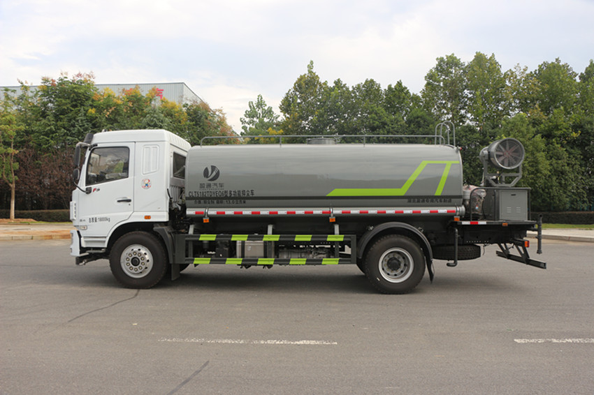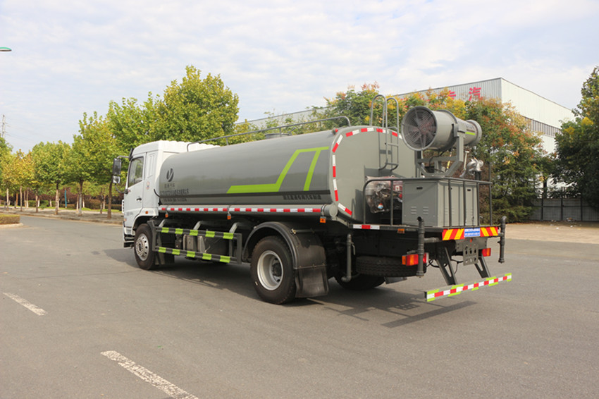 15噸灑水車罐體用4MM碳鋼板制作,罐內隔板具有防波作用,以減低汽車行駛時罐體液體的沖擊。整車帶一個專用灑水泵(垂直吸程7米),灑水寬度14米,射程28米。多功能灑水車配備2個前沖(噴)(能將路面泥巴、塵土、垃圾沖干凈);2個后灑(能均勻地將水灑在路面,一次灑水寬度14米)、2個側噴(花灑)(能均勻地將路旁綠化帶澆灌)、帶1個后工作平臺,平臺上安裝1個綠化灑水高炮(灑水炮可全方位旋轉,可連續調成直沖狀、大雨、小雨、毛毛雨,霧狀可調節沖洗高大樹木),引水時間<5min,流量60m3/h。帶1個消防接頭,帶1個自流閥,1個過濾裝置、人性化爬梯及側防護欄,安裝灑水音樂喇叭