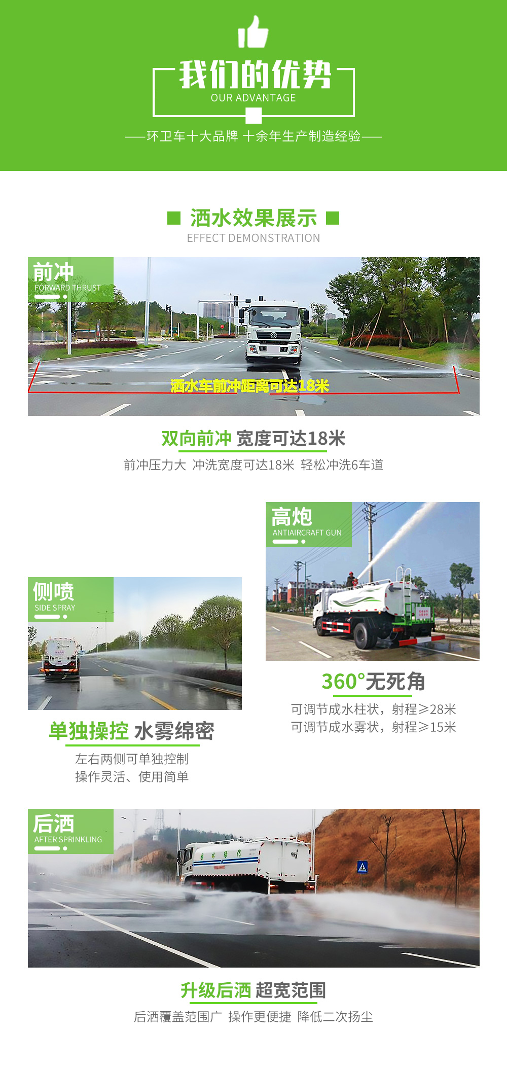 東風華神T1灑水車專用功能配置:罐體實際容積約為9.35立方米,采用武鋼優質碳鋼板卷壓成型。配備專用灑水泵,自吸自排,前噴后灑、側噴、后工作平臺及灑水高壓炮。灑水泵自吸高度為6米左右,整車灑水寬度14米左右,后工作平臺水炮可調成:直沖狀、大雨、中雨、小雨、毛毛雨,有效射程≥28米,整車帶接頭、水位計,自流閥。后工作平臺主管道有一個一寸的澆花接口,附送2根3米水管,1個爬梯,兩側及后保險杠。