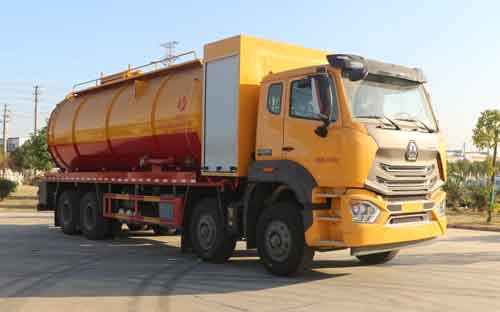 該車專用裝置主要為污水罐和清水罐,用于下水道吸污及疏通。隨底盤選裝駕駛室;罐體尺寸(直段長×直徑)(mm):7100×2350,其中罐體前端為清水罐(直段長3150mm);后端為污水罐(直段長3950mm)。兩罐獨立,且不能同時滿載。清洗功能時用清水罐,吸污功能時用污水罐。污水罐有效容積14.57立方米,介質:液態污物,密度:800千克/立方米;清水罐有效容積11.66立方米,介質:水,密度:1000千克/立方米。采用軸距(mm):1800+4600+1350,1800+4575+1400;側/后防護材料均為:Q235碳鋼,連接方式均為:螺栓連接,后部防護截面尺寸(mm):200×60,后部防護離地高度(mm):480;ABS系統型號為446 004 6300,生產企業為威伯科汽車控制系統(中國)有限公司。選裝EBS,EBS系統控制器生產企業:威伯科汽車控制系統(中國)有限公司,型號:EBS3。選裝罐體頂部護欄樣式,選裝側面清洗管,選裝后罐口液壓開啟樣式,選裝后部閥門,選裝后部清洗管卷盤樣式。選裝前部不帶卷簾門保護箱.