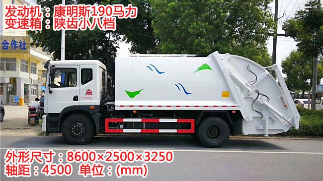東風T5壓縮式垃圾車,T5加寬駕駛室,4×2驅動,發動機康明斯190馬力,陜齒小8檔變速箱,軸距4.5米,前橋5噸,后橋10噸,10.00R20鋼絲胎,帶有ABS,方向助力。