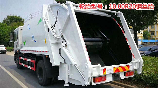 容積12~14立方米,弧形箱體,邊4底5碳鋼材質,內有推板、刮板、后翻轉、后部鎖緊門,國內品牌油缸、多路閥、油泵,高密度液壓油管。